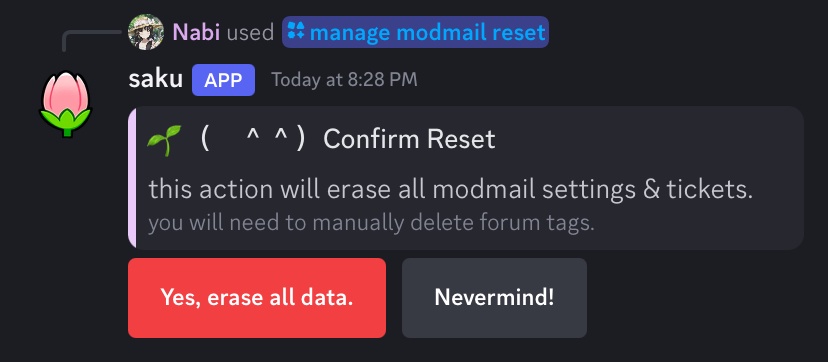this will erase all of the module's data, including: embeds, tags, and tickets.